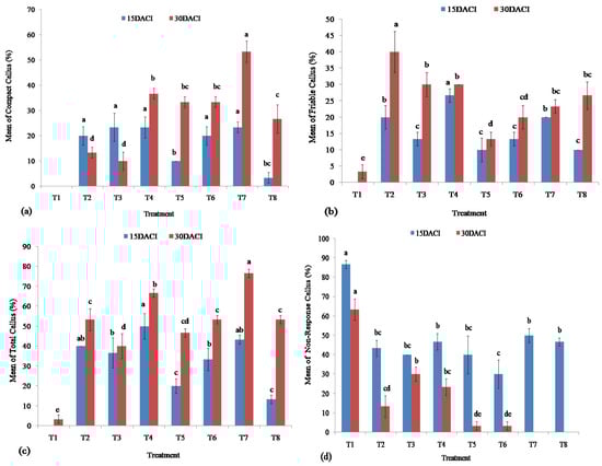 Frequencies of callus induction during in vitro culture of stevia on MS media supplemented with different concentrations of 2,4-D and zeatin: (a) compact callus; (b) friable callus; (c) total callus; and (d) non-response of stevia explants. Bars denote the mean of three replications per treatment ± SE (standard error). Mean values with the same letters are not significantly different based on the Student’s t-test at p = 0.05.