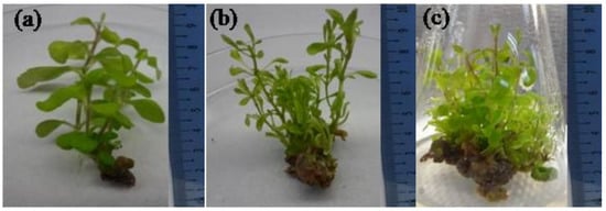 Regenerated shoots of stevia from induced calli on MS media supplemented with different concentrations of BAP and NAA at 30 DACI: (a) regenerated shoots on MS media with 1.00 mg/L BAP and 1.00 mg/L NAA; (b) regenerated shoots on MS media with 5.00 mg/L BAP and 0.00 mg/L NAA; and (c) regenerated shoots on MS media with 10.00 mg/L BAP.