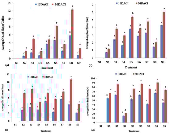 Shoot proliferation of stevia on MS media supplemented with different concentrations of BAP and NAA at 15 and 30 days after inoculation (DACI): (a) No. of shoots induced per callus; (b) Length of induced shoots; (c) No. of leaves per shoot; and (d) Percentage of shoot proliferation. Bars denote the mean of three replications per treatment ± SE (standard error). Mean values with the same letters are not significantly different based on the Student’s t-test at p = 0.05.
