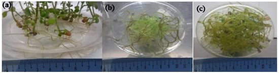Regenerated roots from stevia shoot on different strengths of MS media at 30 DACI: (a) initiated roots on 0.25 MS media; (b) initiated roots on 0.50 MS media; and (c) initiated roots on 1.00 MS media.