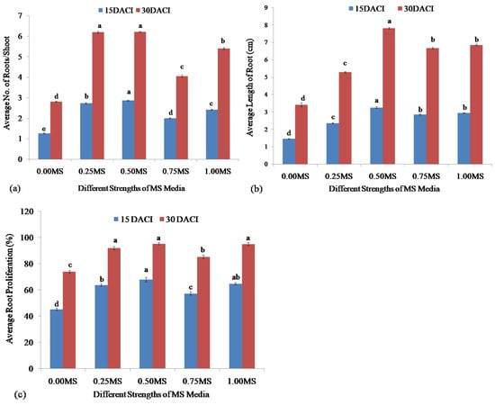 The proliferated shoots were transferred into different strengths of MS (0.00, 0.25, 0.50, 0.75, and 1.00) media without any plant growth hormones to develop roots. At 15 and 30 DACI of shoot for initiation of roots, the number of roots, the number of roots per shoot, the length of roots, and the percentage of shoots able to initiate roots were measured and quantified. This experiment was replicated three times and each replication consisted of 10 conical flasks, with every flask containing 10 shoots.