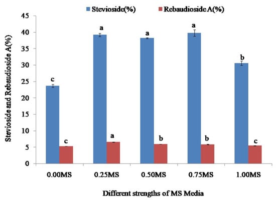 The accumulation of stevioside and rebaudioside A in the leaves of stevia grown on different strengths of MS (0.0, 0.25, 0.50, 0.75, and 1.00) media was investigated in this study.All validated efforts that employed HPLC analysis to identify stevioside and rebaudioside A fulfilled the standardized guidelines. The determination of stevioside and rebaudioside A content in the leaves of stevia grown on different strengths of MS (0.00, 0.25, 0.50, 0.75, and 1.00) media revealed that all of the treatments used for rooting of stevia resulted in different accumulation levels of stevioside and rebaudioside A. The highest (39.76%) accumulation of stevioside was found in the leaves of stevia grown on 0.75 MS media, followed by 39.17 and 38.16% from the leaves grown on 0.25 MS and 0.50 MS media, respectively. The lowest (23.67%) level of stevioside accumulation was found in the leaves of stevia grown on 0.00 MS media and was significantly different from the stevioside accumulation in the leaves of stevia grown on 0.25 MS, 0.50 MS, 0.75 MS, and 1.00 MS media. The leaves of stevia rooted on 1.00 MS media accumulated 30.56% stevioside (Figure 8).