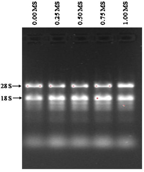 For isolation of total RNA from stevia, 100 mg of fresh leaves were collected from each sample grown on 0.00 MS, 0.25 MS, 0.50 MS, 0.75 MS, and 1.00 MS rooting media. The leaf samples were placedinto two milliliters flat bottom Eppendorf tubes and flash frozen by keeping them in liquid nitrogen for 10 min. Total RNA was isolated using TRI Reagent® ((Sigma-Aldrich Chemie GmbH, Eschenstr. 5, 82024 Taufkirchen, Germany, Catalog Number: 9404) following the manufacturer’s procedures. Concentrations of the isolated RNAs were measured by a Thermo Scientific™ NanoDrop™ 1000 Light Spectrophotometer, and the quality was confirmed by gel electrophoresis on 1.2% (w/v) agarose gel containing 1% florosafe at 50 volts for 60 min in 1× TBE buffer.