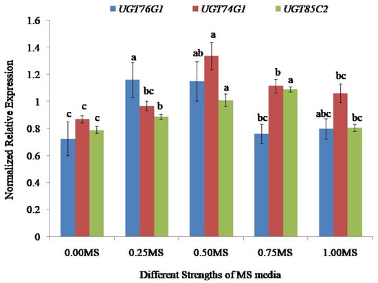In order to quantify the expression level of UGT76G1, UGT74G1, and UGT85C2, RT q-PCR analysis was conducted using cDNA synthesized from RNA extracted from the leaves of stevia rooted in 0.00 MS, 0.25 MS, 0.50 MS, 0.75 MS, and 1.00 MS media. The total RNA (1.00 µg per 20 µL) was reverse transcribed with SensiFAST™ cDNA Synthesis Kit (Bioline Ltd., London, UK, Catalog number: BIO-65053) according to the manufacturer’s procedures. Gene-specific primers for the targeted gene: UGT76G1, UGT74G1, and UGT85C2 and reference genes: Actin (AF548026.1), Aquaporin (DQ269455.1), and Calmodulin (AF474074.1) were designed and synthesized as listed in Table 3. A Bio-Rad CFX96 real-time machine (C1000 Touch thermal cycler) was used to perform quantitative reverse transcription PCR with a SensiFast SYBR No-ROX Kit (Bioline Ltd., London, UK, Catalog Number: BIO-98005). The reaction mixture containing the final concentrations of 1× SensiFast SYBR No-ROX, template cDNA (5 ng of total RNA) and 200 nM of each forward and reverse primer was prepared in a final volume of 10 µL. No template control (NTC) was prepared to contain all the reaction mixtures without the template. NTC was set as a negative control wherein the absence of amplification denoted no cross-contamination mixtures.
