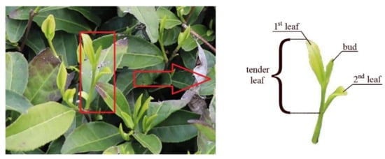 Tea is one of the most common beverages in the world [1]. Among them, green tea has the largest production, export, and consumption rates in China. Tea can be harvested in spring, summer, and autumn. Finished tea made from tender leaves and plucked in early spring (Figure 1) has the best quality and the highest economic value [2]. At present, such tender leaves can only be plucked manually across the world. However, hand-plucking tea is very laborious and time-consuming. Therefore, automated machinery that is efficient and suitable for plucking high-quality green tea is necessary for tea plantations. The intelligent identification of tender leaves is one of the key techniques.