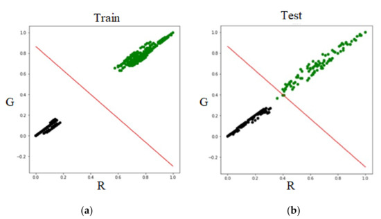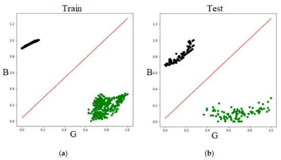 Finally, the two components of G-B were processed (Figure 7). The G-B components of the tender leaf part and the background part in the training dataset and testing dataset are shown. Similarly to above, the horizontal and vertical coordinates were [0, 1]. The accuracy and loss rate of the G-B component in the logistic regression are shown in Table 3. The accuracy reached 100% and the loss rate was infinitely close to 0 as the number of iterations increased. The objective function of the G-B component in the training dataset and the testing dataset are shown in Figure 8 as a red line. The segmentation result of the R-B component of the training dataset and the testing dataset was perfect and there was no point of wrong segmentation. The final output model parameters were = , = , and = and the objective function was . It can be seen from the formula that the G components have a negative correlation and the B components have a positive correlation with the object function, and the weights of the G components are larger.