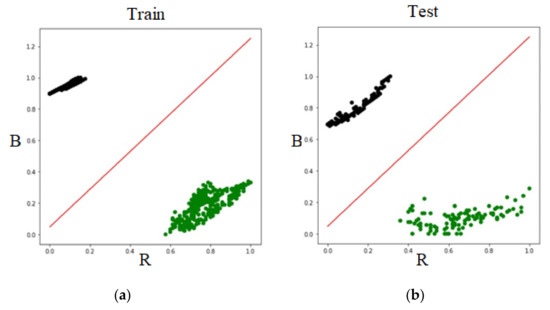 Schematic diagram of R-G-B in logistic regression. (a) Schematic diagram of training dataset. (b) Schematic diagram of testing dataset.