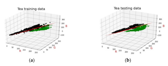 In the three-dimensional space, based on semi-supervised learning and Adam algorithms, the three components of R-G-B were processed (Figure 8). The distribution of the R-G-B components of the tender leaf part and background part in the training dataset and testing dataset are shown. Intuitively, there was not much overlap between the two parts. The background part mainly occupied the middle and upper-left corner area and the tender leaf part mainly occupied the lower-right corner area. The accuracy and loss rate of the R-G-B component in the logistic regression as the model parameters were updated are shown in Table 4. The accuracy was infinitely close to 96% and the loss rate was close to 0 or 18%. The decision boundary of the R-G-B component in the training dataset and the testing dataset are shown in Figure 8 as a red hyperplane, respectively. The segmentation result of the testing dataset was better than that of the training dataset. The final output model parameters were = , = , = , and = , and the objective function of the model was . In this three-dimensional model, the greatest model weights were R, B, and G in that order, with R standing out.