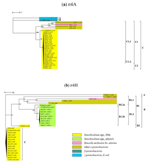 Phylogenetic analysis of trkA (a) and trkH (b) genes in α-, β- and γ-proteobacteria, as well Actinobacteria. The nucleotide substitution models selected for the analysis were TPM3 + F + G4 for trkA sequences and TIM3 + F + G4 for trkH ones. The scale bars were 0.1 for trkA and trkH nucleotide substitutions per site (see Section 2).