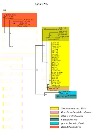 - Roumiantseva, M.L.; Belova, V.S.; Onishchouk, O.P.; Andronov, E.E.; Kurchak, O.N.; Chizhevskaya, E.P.; Rumyantseva, T.B.; Simarov, B.V. Polymorphism of bet-genes among Sinorhizobium meliloti isolates native to gene centers of alfalfa. Agric. Biol. (Sel’skokhozyaistvennaya Biol.) 2011, 3, 48–54. (In Russian) [Google Scholar]