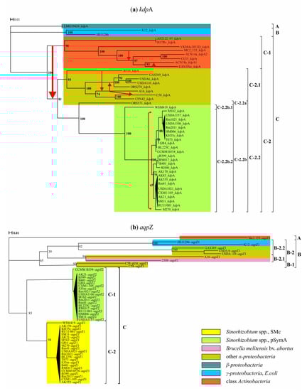A phylogenetic analysis of 46 sequences of the kdpA gene, encoding the transmembrane subunit KdpA, which is related to the binding and transporting of K+ ions [4], revealed three clusters in a state of “soft” polytomy. Group A included kdpA sequences identified in β-proteobacteria, and group B contained sequences identified in γ-proteobacteria. Group C included sequences identified in both α-proteobacteria and Actinobacteria, and had two monophyletic clades (bootstrap 100%). The data obtained supported the presence of a common putative ancestor of the kdpA gene homologues for α-proteobacteria (including S. meliloti) and Actinobacteria. All 26 kdpA sequences of S. meliloti strains (C-2.2.b.2) were in C-2 (bootstrap 100%). The relative rate of the accumulation of substitutions in sequences of the C-1 clade (class: Actinobacteria) as well as in sequences from the subcluster C-2.2.b.2 (S. meliloti) was 7.79641 bp for every 100 bp. It was found that the sequences of the kdpA gene in S. meliloti are under negative selection (Ka/Ks = 0.1317). A comparative analysis of the topology of 16S-PhT and kdpA-PhT showed that the normalized matching split distance for the Yule model was 0.8362, indicating that the vertical inheritance of this gene is not obvious. However, 26 horizontal transfers were found (see Materials and Methods), and 20 of them were detected in the studied S. meliloti strains. This was supported by the probability of matching the topologies of the 16S-PhT (Figure 3) and kdpA-PhT trees (Figure 4a). The facts of the horizontal transfer of the kdpA were established within the class Actinobacteria (between Frankia strains and from Frankia to Mycolicibacterium); the facts of the transfer of this gene within the class of α-proteobacteria (from Azospirillum to Devosia, from Devosia to Agrobacterium and Bradyrhizobium) in addition to the probabilities of horizontal transfer events were backed by 100% bootstrap support. In addition, a transfer event of kdpA was detected between group C-1 (α-proteobacteria) and group C-2 (Actinobacteria), which was confirmed by BD values (131.5%) and bootstrap support (100%). The data obtained allow us to conclude that α-proteobacteria obtained kdpA gene from Actinobacteria as a result of horizontal gene transfer.