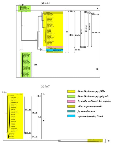 In this research, we have reported for the first time that the betA, betB and betI genes of S. meliloti are phylogenetically closer to the corresponding genes of Agrobacterium spp., which is genetically relative to S. meliloti [73]. Additionally, the betC gene, which was found also in the genomes of S. medicae WSM419, A. fabrum C58 and Rh. etli CFN42, occurred phylogenetically closely related to S. medicae species.