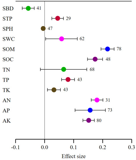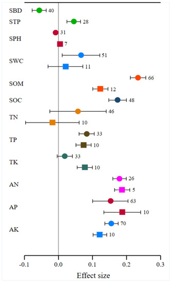The overall effects of living grass mulch on soil physicochemical properties of apple orchards in China. Weighted means and their 95% confidence intervals of the effect sizes are given. The numbers on the right side of the confidence intervals represent the sample sizes. SBD: soil bulk density; STP: soil total porosity; SPH: soil pH; SWC: soil water content; SOM: soil organic matter; SOC: soil organic carbon; TN: soil total nitrogen; TP: soil total phosphorus; TK: soil total potassium; AN: soil available nitrogen; AP: soil available phosphorus; AK: soil available potassium.
