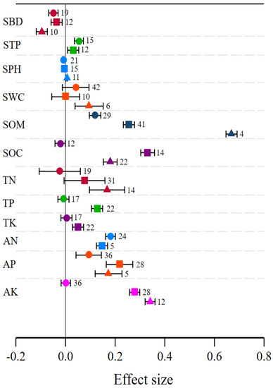 Effects of continuous grass-growing years on soil physicochemical properties of apple orchards in China. The circles represent the initial stage (<3 years), the squares represent the mid-term (3–5 years) and the triangles represent the long-term (>5 years). Weighted means and their 95% confidence intervals of the effect sizes are given. The numbers on the right side of the confidence intervals represent the sample sizes. SBD: soil bulk density; STP: soil total porosity, SPH: soil pH; SWC: soil water content; SOM: soil organic matter; SOC: soil organic carbon; TN: soil total nitrogen; TP: soil total phosphorus; TK: soil total potassium; AN: soil available nitrogen; AP: soil available phosphorus; AK: soil available potassium.