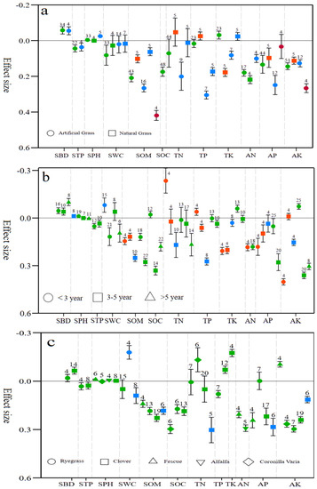 Effects of mulch methods on soil physicochemical properties of apple orchards in China. The circles and squares represent artificial grass and natural grass, respectively. Weighted means and their 95% confidence intervals of the effect sizes are given. The numbers on the right side of the confidence intervals represent the sample sizes. SBD: soil bulk density; STP: soil total porosity; SPH: soil pH; SWC: soil water content; SOM: soil organic matter; SOC: soil organic carbon; TN: soil total nitrogen; TP: soil total phosphorus; TK: soil total potassium; AN: soil available nitrogen; AP: soil available phosphorus; AK: soil available potassium.