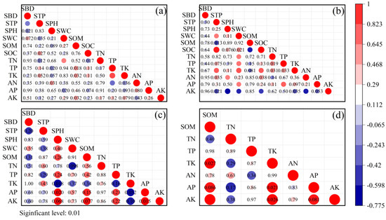 Correlation analysis among different soil characteristics. (a) the whole China region; (b) the warm temperature semid-humid climate region; (c) the temperature semi-humid climate region; (d) the warm temperature arid climate region. SBD: soil bulk density; STP: soil total porosity, SPH: soil pH; SWC: soil water content; SOM: soil organic matter; SOC: soil organic carbon; TN: soil total nitrogen; TP: soil total phosphorus; TK: soil total potassium; AN: soil available nitrogen; AP: soil available phosphorus; AK: soil available potassium.