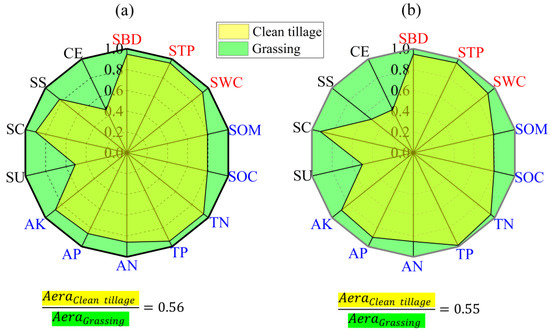 where is the standardized parameter, (i.e., each soil characteristic value should be standardized to 1.0 for apple orchards with living grass mulch); and are the mean of various soil characteristics under living grass mulch and clear tillage, respectively; is the total number of soil characteristics used for SQI and (3.14). SQI-area based on a radar map was suitable for the unified assessment and comparison of the variation degree of any number of soil characteristics. The ratio of the sum of all triangle areas in a radar map to its total area reflects the variation degree of soil quality.