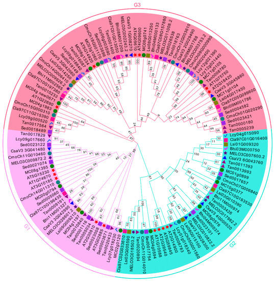 To clarify the evolutionary relationship of GASA family genes in 10 Cucurbitaceae species, all 114 Cucurbitaceae GASA proteins and 15 Arabidopsis GASA proteins were used to construct a phylogenetic tree by multiple sequence alignment (Figure 1). According to the classification results of Arabidopsis GASA family genes [10], the phylogenetic tree was divided into three subgroups, namely G1, G2 and G3. Among them, the G3 subgroup contained the largest number of GASA genes, a total of 60. The G2 subgroup had the second largest number of GASA genes, totaling 38. The G1 subgroups had the smallest number of GASA genes, at 31. The GASA family proteins in every Cucurbitaceae species could be divided into these three subfamilies.