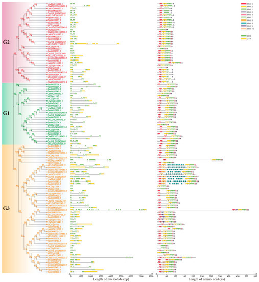The diagrams of phylogenetic tree and gene structures of GASA family genes in 10 Cucurbitaceae species were drawn with TBtools software. The results of phylogenetic tree analysis showed that GASA genes of 10 Cucurbitaceae species could be divided into three subgroups, namely G1, G2 and G3 subgroups (Figure 2), which was consistent with the clustering results for GASA proteins in Arabidopsis and 10 Cucurbitaceae species (Figure 1). Among them, there were 54 GASA genes in the G3 subgroup, 34 GASA genes in the G2 subgroup and 26 GASA genes in the G1 subgroup. The gene structure analysis showed that most of the GASA genes in the G2 subgroup were composed of two exons, while most of the GASA genes in the G1 subgroup were composed of four exons. In the G3 subgroup, most of the GASA genes were composed of three or four exons (Figure 2).