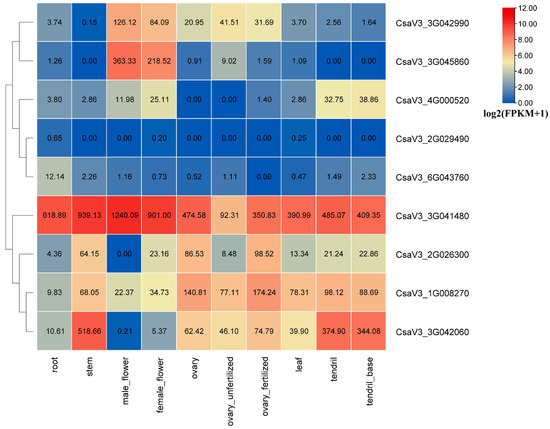 To analyze the tissue-specific expression patterns of GASA genes in cucumber, the transcriptome sequencing data of 10 types of cucumber tissues (obtained from the published SRA data PRJNA80169) [71] were reanalyzed with ChineseLong_V3 genome. The results indicated that the GASA gene CsaV3_2G029490 was lowly or not expressed in the cucumber tissues. The CsaV3_3G041480 gene was highly expressed in all of the cucumber tissues. The CsaV3_3G042990 gene was expressed in all of the cucumber tissues, with the highest expression levels in the male and female flowers, followed by the ovaries, and was lowly expressed in the root, stem, leaf and tendril. The CsaV3_3G045860 gene was mainly expressed in the male and female flowers, but was not expressed in stem and tendril, and lowly expressed in the other tissues. The CsaV3_4G000520 gene was highly expressed in the tendrils and flowers, but was not expressed in the ovaries, and lowly expressed in the root, stem and leaf. The CsaV3_6G043760 gene was lowly expressed in all tissues of cucumber, with a relatively high expression level in the root, and was not expressed in the fertilized ovary. The CsaV3_2G026300 gene was not expressed in the male flower, but was lowly expressed in the root and highly expressed in the other tissues. The CsaV3_1G008270 gene was highly expressed in all cucumber tissues except the root. The CsaV3_3G042060 gene was expressed in all tissues, with lower expression levels in the male and female flowers, and higher expression levels in the other tissues (Figure 5).