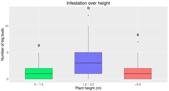 Overall infestation of hazelnut plants over the band heights, with no distinction between 2021 and 2022. Different letters indicate significant difference between the height ranges after Bonferroni post hoc test (p < 0.05).