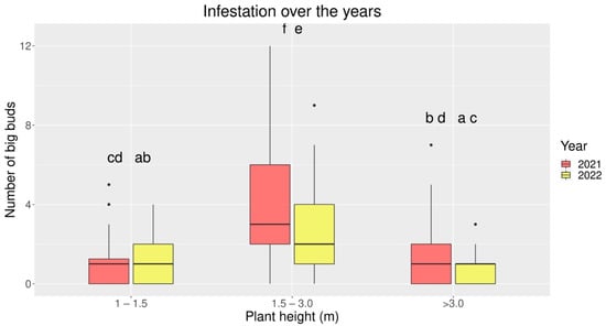 Overall infestation of hazelnut plants over the band heights, distinguishing between 2021 and 2022. Different letters indicate significant difference between the year of survey and height ranges after Bonferroni post hoc test at p < 0.05.