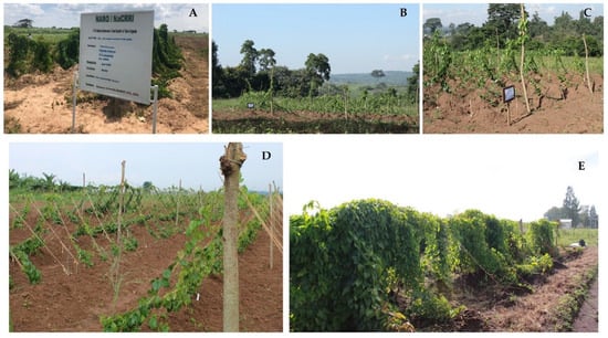 Pictures of yam trials at three experimental sites. (A) = Serere; (B–D) = Namulonge; (E) = Arua.