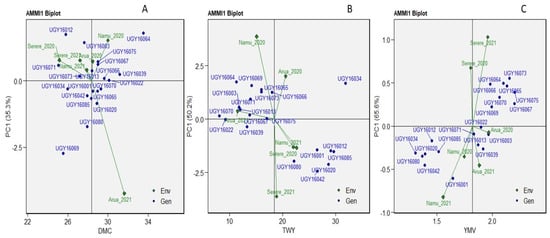 The AMMI biplots (Figure 3) depicted correlations between IPCA 1 and genotype means for the various traits studied. Genotype UGY16022 had the lowest absolute IPCA 1 (0.033) value for dry matter content, and was thus the most stable genotype throughout the six-test environments, followed by UGY16066 (0.09) and UGY16073 (0.18) (Table 10; Figure 3A). Based on the absolute score for IPAC 1 (2.717), UGY16069 showed the least stable dry matter response in the six environments. With the exception of genotypes UGY16022, UGY16066, and UGY16073, most of the genotypes in the dry matter content evaluation had absolute IPAC scores that were far from zero, indicating that the genotypes’ performance was usually unstable for the trait (Table 10; Figure 3A).