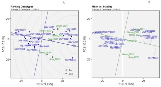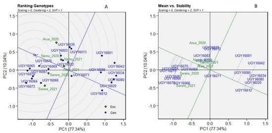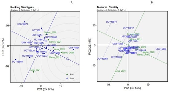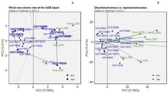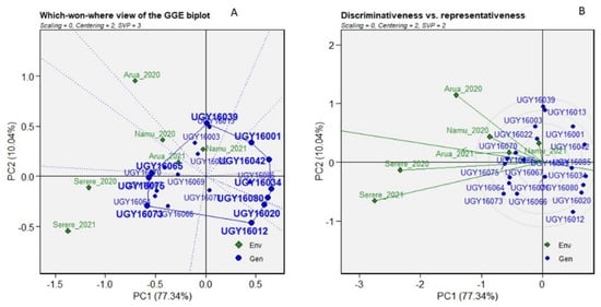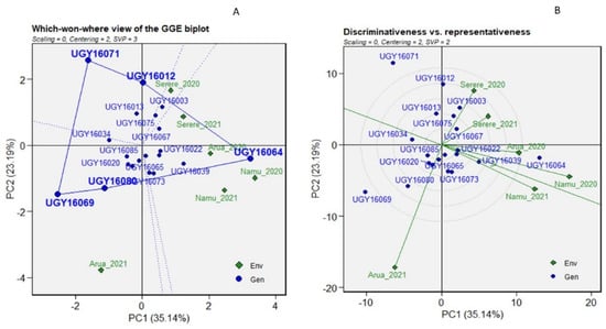 For dry matter content, the GGE ranking and stability biplot (Figure 8) gives a good visual assessment with both PC1 and PC2 explaining about 58.33% of the total variation observed. The biplot indicated that the six test environments were grouped into three mega-environments in terms of dry matter content. The first mega-environment included only Arua 2021 with the best genotype being UGY16069 (Figure 8A). The second mega-environment comprised Namulonge 2020, Namulonge 2021, Arua 2020, and Serere 2021 with the best performing genotype being UGY16064 (Figure 8A). The third mega-environment consisted of Serere 2020, with genotype UGY16003 as the best performer. The GGE biplot (Figure 9A,B) showed that Arua 2021 was the most discriminating environment, while Serere 2021 was the least discriminating of the six test environments. This was revealed by the long and short environment vectors of Arua 2021 and Serere 2021, respectively. Of all the six environments, Arua 2020 was the most representative of the mega-environment, according to the small angle from the average environment axis (Figure 9B).