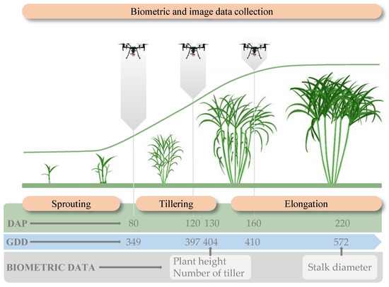 Illustrative example for data collection (flights, growing degree days, and biometric data) throughout the days after planting.