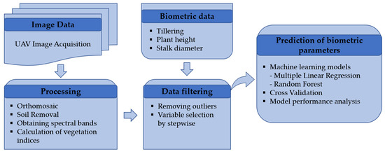 A functional dataset was generated to group the data (Figure 2). The spectral data corresponding to each image collection date were evaluated separately and together to determine which one performs best in predicting the parameters. The independent variables used in the models were spectral bands (Table 1) and three VIs (Table 2). The biometric parameters of sugarcane measured in the field consisted of dependent variables. We used the Z-score method to detect and remove outliers from the dataset [27]. The stepwise analysis was performed using the RF algorithm to select the best independent variables to be used in the prediction models. This method determines the variables that have the greatest influence on the result set. Thus, we used only those that provide the greatest efficiency in the model. The root mean square error (RMSE) was the metric used to select the best performing predictor variables by stepwise.