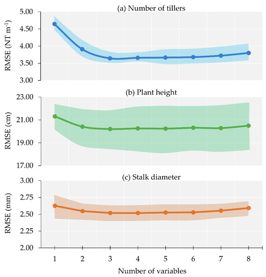 We obtained two predictor combinations with good performance composed of two and three variables. The first selected combination composed of two variables was represented by the Blue and Green spectral bands, while the second combination corresponded to the Blue, Green, and NIR bands. The combination of two and three variables was similar for NT, with RMSE = 3.9 and 3.6, respectively. We noted that performance was stable using two to six variables (Figure 3a). The same was observed for SD (Figure 3c). Thus, using one variable or more than six increases the error. The predictor variables for SD showed RMSE = 2.54 mm and 2.52 mm for two and three variables, respectively. Different results were found for PH. The numbers of variables showed similar results, with quickly better results for two (RMSE = 20.4 cm) and three variables (RMSE = 20.2 cm). Thus, models were tested using the two selected combinations of variables, with two and three variables, as all bands in the first combination (two variables) are in the visible spectral region.