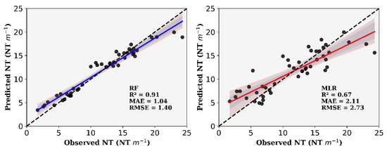 Scatter plots of observed and predicted NT values for RF and MLR. The plots are based on the selection of three variables and combination of images collected at 349 and 397 GDD.