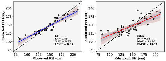MLR-based models were not as efficient as RF. However, an accuracy >0.60 could be obtained when we used two and three variables (Table 4). Once again, models with three variables were more accurate and precise. Our results showed better fit for fusions of GDD = 349 and 397 (R2 = 0.60, MAE = 12.89 cm, and RMSE = 16.32 cm). Nevertheless, we can still achieve potential results for independent predictors, especially at 397 GDD (R2 = 0.53, MAE = 14.09 cm, and RMSE = 17.49 cm). The fit of the observed and predicted PH is shown in Figure 5.