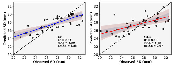 Scatter plots of observed and predicted SD values for RF and MLR. The plots are based on the selection of three variables and the combination of images collected at 349, 397, and 410 GDD.