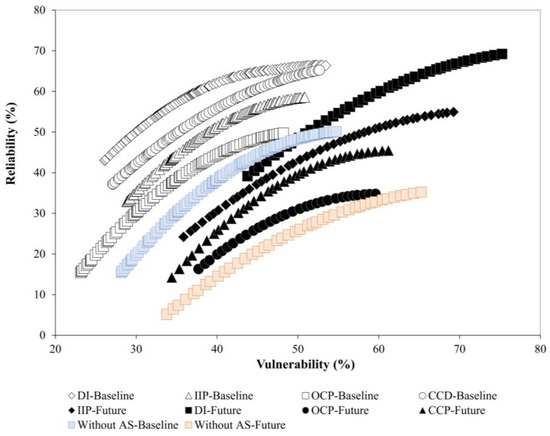 Consideration of AS decreased the Vulnerability Index and increased the Reliability Index, as shown in Figure 2. In the next step, the optimal rules for the baseline and future conditions for water demand were evaluated. A comparison was made in this section between the optimal rules obtained from the baseline conditions (scenario 1), applying optimal baseline rules for the climate change conditions (scenario 2), and applying optimal rules for the climate change conditions (scenario 3). In Figure 3, the first and third scenarios’ results of 45% vulnerability, considering or without considering four AS, are provided, respectively.
