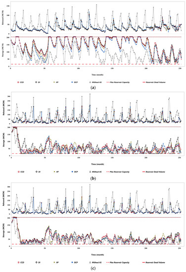 As shown in Figure 3b,c, without AS for 161 months, reservoir storage was between 16 (dead volume) and 30 MCM. Under the second scenario, in 200 months, the storage volume in all four AS was between 20 and 80 MCM, and under the third scenario, in 230 months, it was between 20 and 100 MCM. The storage volume reached more than 200 MCM in just six months for both scenarios. The maximum released volumes for the OCP were 204 and 206 million cubic meters, respectively, for the second and third scenarios. Based on the figures, it can be stated that the total average released volume in scenario three was reduced by 14, 15, 11 and 13%, respectively, compared to scenario two, corresponding to CCP, IIP, DI and CCD. Accordingly, the allocation rules derived from the third scenario were superior to those of the second scenario. In addition, employing AS reduced the released volume and increased reservoir capacity in all scenarios.