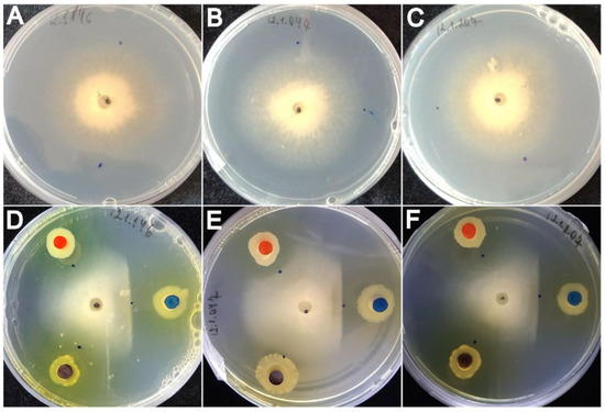 In vitro antagonism by strains of fluorescent Pseudomonas species against Pyricularia oryzae Triticum lineage (PoTl). (A–C): PoTl isolates only (12.1.146, 12.1.047 and 12.1.207). (D–F): P. wayambapalatensis ‘Amana’ (blue mark; P. putida group); Pseudomonas sp. nov. ‘Poti’ (black mark; P. asplenii group) and Pseudomonas sp. nov. ‘Yara’ (red mark; P. putida group) paired with PoTl (colony in the center).