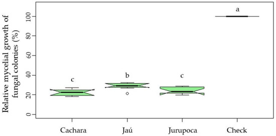 Boxplot distribution of relative mycelial growth of Pyricularia oryzae Triticum lineage (PoTl) under in vitro antagonism of three Trichoderma species. Each boxplot represents the distribution of values from three PoTl isolates (12.1.047, 12.1.146 and 12.1.207). Means followed by the same letters (a–c) are not significantly different using the Tukey test at p ≤ 0.05.
