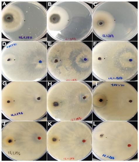 In vitro antagonism of Trichoderma species against Pyricularia oryzae Triticum lineage (PoTl). (A–C): PoTl isolates only (12.1.146, 12.1.047 and 12.1.207); (D–F): PoTl isolates paired with T. koningiopsis ‘Cachara’; (G–I): PoTl isolates paired with T. virens ‘Jau’; (J–L): PoTl isolates paired with T. lentiforme ‘Jurupoca’.