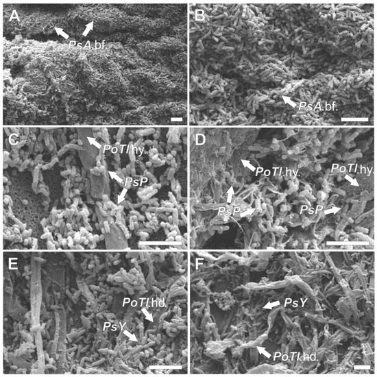 The scanning electron micrographs (SEM) from the antagonistic in vitro tests allowed the observation of bacterial cells’ (from the Amana, Poti and Yara Pseudomonas strains) colonization on the PoTl hyphae surface, with biofilm development (Figure 5). The Amana strain aggressively grew over the PoTl hyphae, with extensive biofilm formation (Figure 5A,B). Both Poti and Yara strains also developed biofilm over the PoTl hyphae surface (Figure 5C–F). In addition, the interaction with the Yara strain led to PoTl hyphae damage (Figure 5F, arrow).