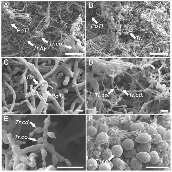 In comparison, we also performed SEM analyses of the in vitro interaction of the T. koningiopsis Cachara isolate against PoTl. Extensive hyphae growth and abundant sporulation of Trichoderma over the PoTl aerial mycelium were observed (Figure 6A,B,D–F). Mycoparasitism was also detected, which was characterized by Trichoderma forming a hyphal coiled structure to parasitize PoTl (Figure 6C).