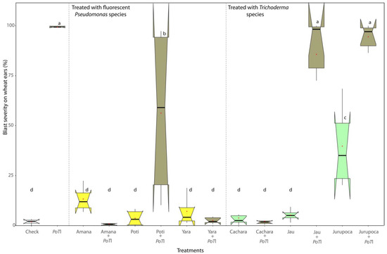 All non-inoculated plots (represented by yellow or light green boxplots) treated only with the potential bacterial or fungal biocontrol agents, had significantly lower severity values, also not significantly distinct from the non-inoculated negative check. The only exception was the treatment with T. lentiforme ‘Jurupoca’, which showed a slightly higher disease severity, though significantly different from the positive check (Figure 7 and Figure 8). The incidence of head blast in this particular treatment may be associated with seedborne inoculum, since we opted for not treating the seed lot with fungicides.