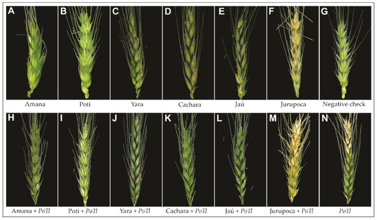 The biocontrol agents were sprayed on the entire wheat plant at 60 days after emergence at the Feeks’ head stage 10.5 [36], 7 days before the inoculation of the pathogen. The following treatments were applied: (1) Amana; (2) Poti; (3) Yara; (4) Cachara; (5) Jau; (6) Jurupoca; (7) Amana + PoTl; (8) Poti + PoTl; (9) Yara + PoTl; (10) Cachara + PoTl; (11) Jau + PoTl; (12) Jurupoca + PoTl; (13) negative control (no PoTl) and (14) positive control (+PoTl).
