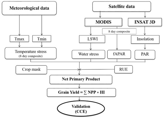 Total NPP was computed for the whole growing season of the rice from 8-day composite datasets. Rice yield was calculated from the product total NPP and harvest index of the rice. The overall methodology of the semi-physical approach is presented in Figure 3.