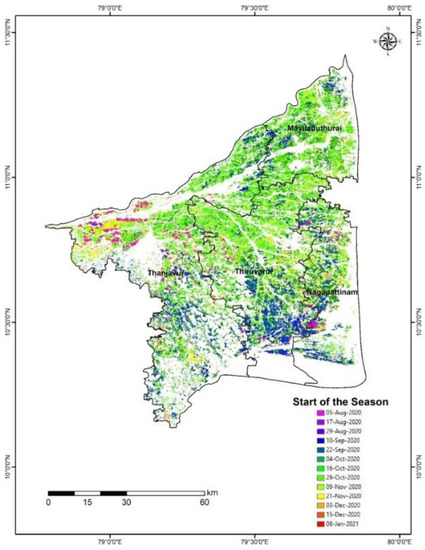 Start of the Season (SoS) map for rice in Cauvery Delta Region during 2020.