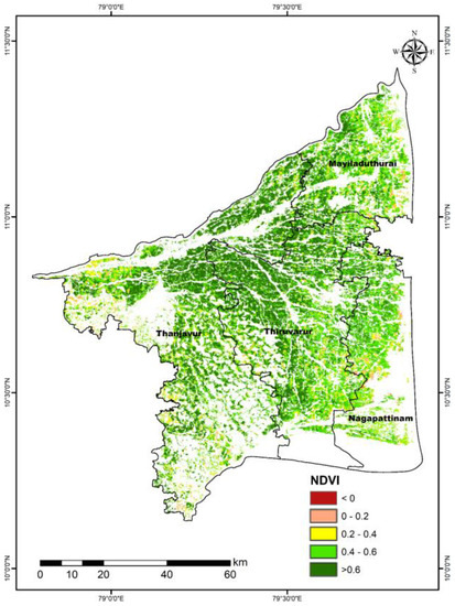 Sentinel 2 satellite datasets were acquired across the Cauvery Delta region during the crop growing season. Optical data for the research region was accessible in four tiles, and mosaicking makes handling datasets easier. The mosaicking of these tiles was carried out in ArcGIS software. Sentinel 2 data was used to estimate NDVI for the peak vegetative period of rice during the growing season. LSWI was calculated using high-resolution optical satellite data for rice’s peak vegetative season. LAI values at the early stage of leaf expansion were extracted from Sentinel 1A SAR backscatter using a modified version of the water cloud vegetation model established by Yang et al. [16], based on empirical assumptions of plant height and moisture dynamics.