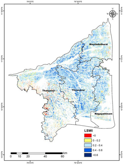 Crop health and productivity were measured indirectly using spectral vegetation indices. According to Groten [19], regressions based on averaged maximum values yielded better results than regressions based on NDVI integration throughout growth stages. The Thanjavur, Thiruvarur, and Mayiladuthurai districts mean NDVI values varied between 0.34 and 0.38, with a mean of 0.36. With a mean of 0.68, the maximum NDVI value was between 0.67 and 0.70 (Figure 8). LSWI is a useful tool for assessing early-season drought and a reliable predictor of vegetation dynamics and crop yield. The mean LSWI for the studied area is 0.27 to 0.31, with the mean LSWI ranging from 0.27 to 0.31. Rice has a maximum LSWI value of 0.36 to 0.41 and a lowest LSWI value of 0.12 to 0.19 (Figure 9). According to Prasetyo et al. [20], a yield model based on NDVI and LSWI proved reliable in estimating rice production. Siyal et al. [21] utilized peak vegetative rice growth period NDVI values and found strong correlations between peak NDVI and actual rice yield. Satir and Berberoglu [22] reported that NDVI positively correlated with crop yield.