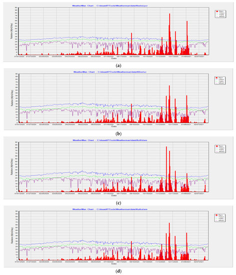 (a) Weather chart generated from DSSAT for Keelaiyur. (b) Weather chart generated from DSSAT for Kilvelur. (c) Weather chart generated from DSSAT for Kollidam. (d) Weather chart generated from DSSAT for Kuthalam.