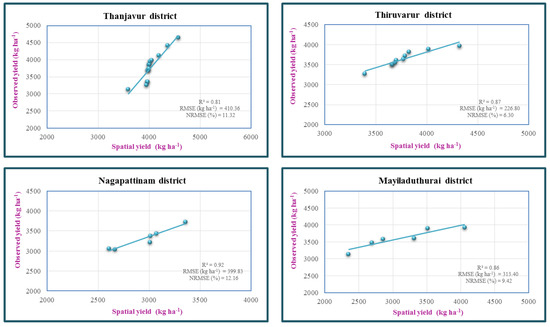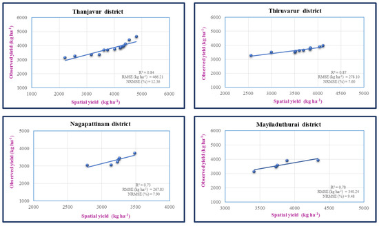 According to Maloom et al. [26], regression analysis is a valuable tool for developing yield prediction models. Spectral indices based on regression analysis resulted in a mean rice yield of 3654 kg ha−1 in the study area. The highest rice yield of 3905 kg ha−1 was registered in the Thanjavur district, followed by Mayiladuthurai, Thiruvarur, and Nagapattinam districts with the values of 3826, 3652, and 3234 kg ha−1, respectively (Figure 11) (Table 2). The mean agreement between estimated and observed yield at the district level was found between 87.64 to 92.40, with a mean of 90.52. The mean R2, RMSE, and NRMSE were 0.81, 340.24 kg ha−1, and 9.48%, respectively.